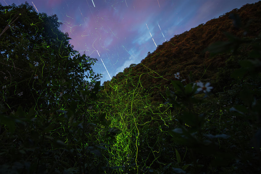 The light emitted by fireflies is filled with a unique sense of beauty and mystery. It is soft yet striking, like the glow of fairies that shifts between yellow-green, green, and orange-yellow, forming a distinct rhythm. From a photographic perspective, the light and flight paths of fireflies create an enchanting visual language. Within the focal plane, tiny points of light or delicate streaks appear elegant and serene; outside the focal plane, they transform into larger light dots and smooth trails. The varying flight speed and flashing rhythm of fireflies produce dynamic effects that are either brief or elongated, like natural brushstrokes that gently dance through the night, perfectly merging with the rhythm of the space.