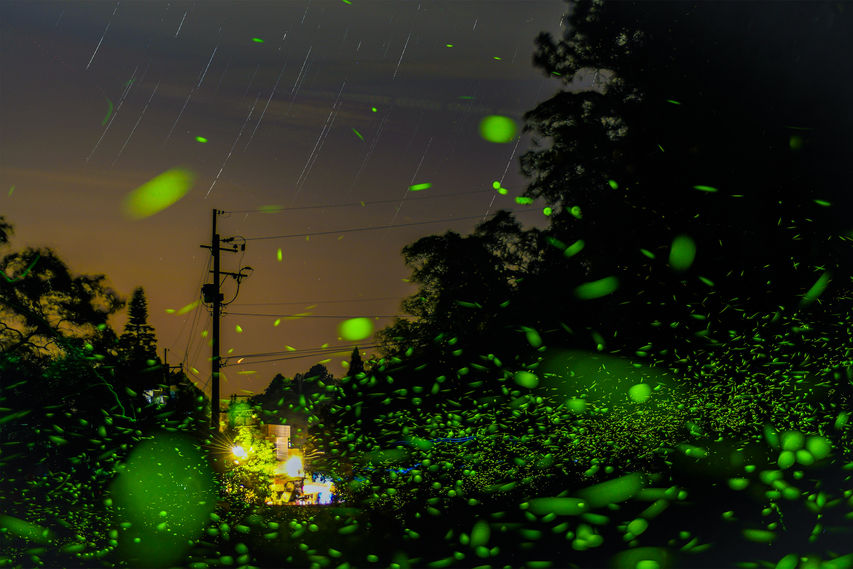 From April to June, as the warm climate arrives, fireflies quietly emerge in moist, cool, and unpolluted areas, illuminating the night. Their light organ, located at the tip of their abdomen, contains bioluminescent substances and enzymes, which produce a glow through catalysis. This light is not just their means of communication, attraction, warning, or intimidation but also resembles the brushstrokes of a hidden painter, subtly painting starlike trails in the forest and grass. The gentle, floating glow of fireflies flows like a symphony in the quiet woods, with flickering yellow-green dots that softly light up the path, like stars scattered on the earth.